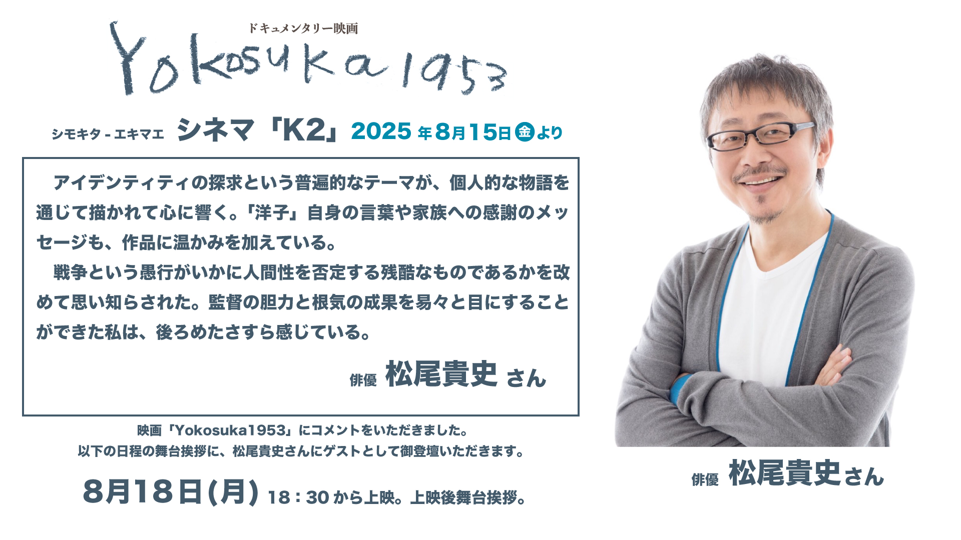 舞台挨拶ゲスト 松尾貴史さん 2025 8/13 Directorニュース 横須賀一九五三 2025年8月13日 シモキタ エキマエ シネマ『K2』で8月15日からスタートする「Yokosuka1953」リバイバル上映。18日(月)のゲストに、松尾貴史さんにきていただけることになりました。 予約は、以下のボタンからお願いします。 劇場予約サイト Directorニュース 横須賀一九五三 よかったらシェアしてね! URLをコピーしました! URLをコピーしました! 初日舞台挨拶ゲスト 安田菜津紀さん アリオ八尾 光町スクエアでイベントを行います この記事を書いた人 tsuyoshi 関連記事 企画展:日米を交差した人々 2026年1月16日 アジアンドキュメンタリーズで配信開始 2026年1月5日 2025.12.31.に想う。 2025年12月31日 もう一つの物語——函館で生まれた女性 2025年12月28日 和歌山県串本:田並劇場で上映会 2025年12月26日 澤山さんを偲んで、12月7日、K’s Cinemaで上映 2025年12月2日 熊谷シネティアラ21でも再上映! 2025年10月2日 アリオ八尾 光町スクエアでイベントを行います 2025年9月9日 コメント コメントする コメントをキャンセルコメント ※ 名前 ※ メール ※ サイト 次回のコメントで使用するためブラウザーに自分の名前、メールアドレス、サイトを保存する。 上に表示された文字を入力してください。 Δ