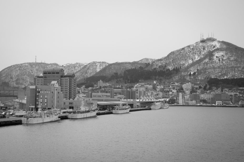 しばらく街を歩き、丘陵地の中腹まで進むと、広い道路が交差するところに「旧町名 天神町」と刻まれた石碑が立っていた──ここだ。そこからは函館湾を望むことができた。遠くの山々にはまだ雪が残っていた。