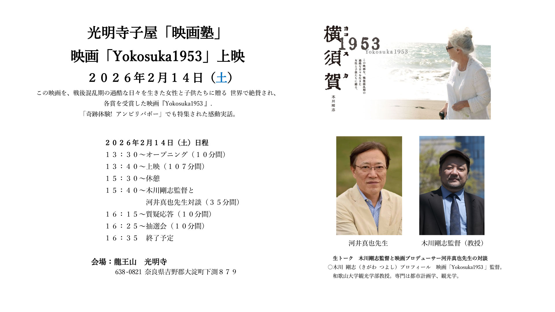 2026年2月14日(土)、奈良県大淀町・龍王山光明寺にて、映画『Yokosuka1953』の上映会が開催されます。